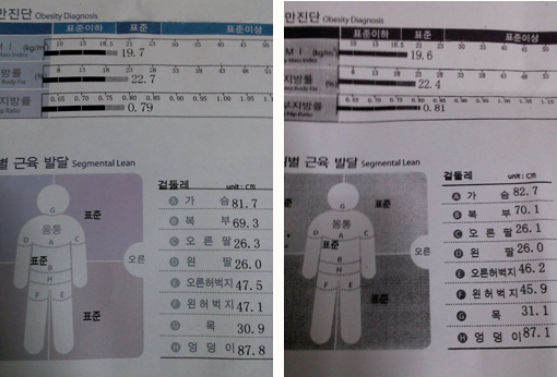 여튼 끝냈으니까 인바디나 해보자하고 체크를 했는데 시술전에 쟀던 인바디랑 비교를 해보니 체중부터 거의 모든 수치가 비슷한데 체지방이 조금 줄었고 신체사이즈에서 확실히 허벅지랑 엉덩이만 사이즈가 줄어있더라구요~!