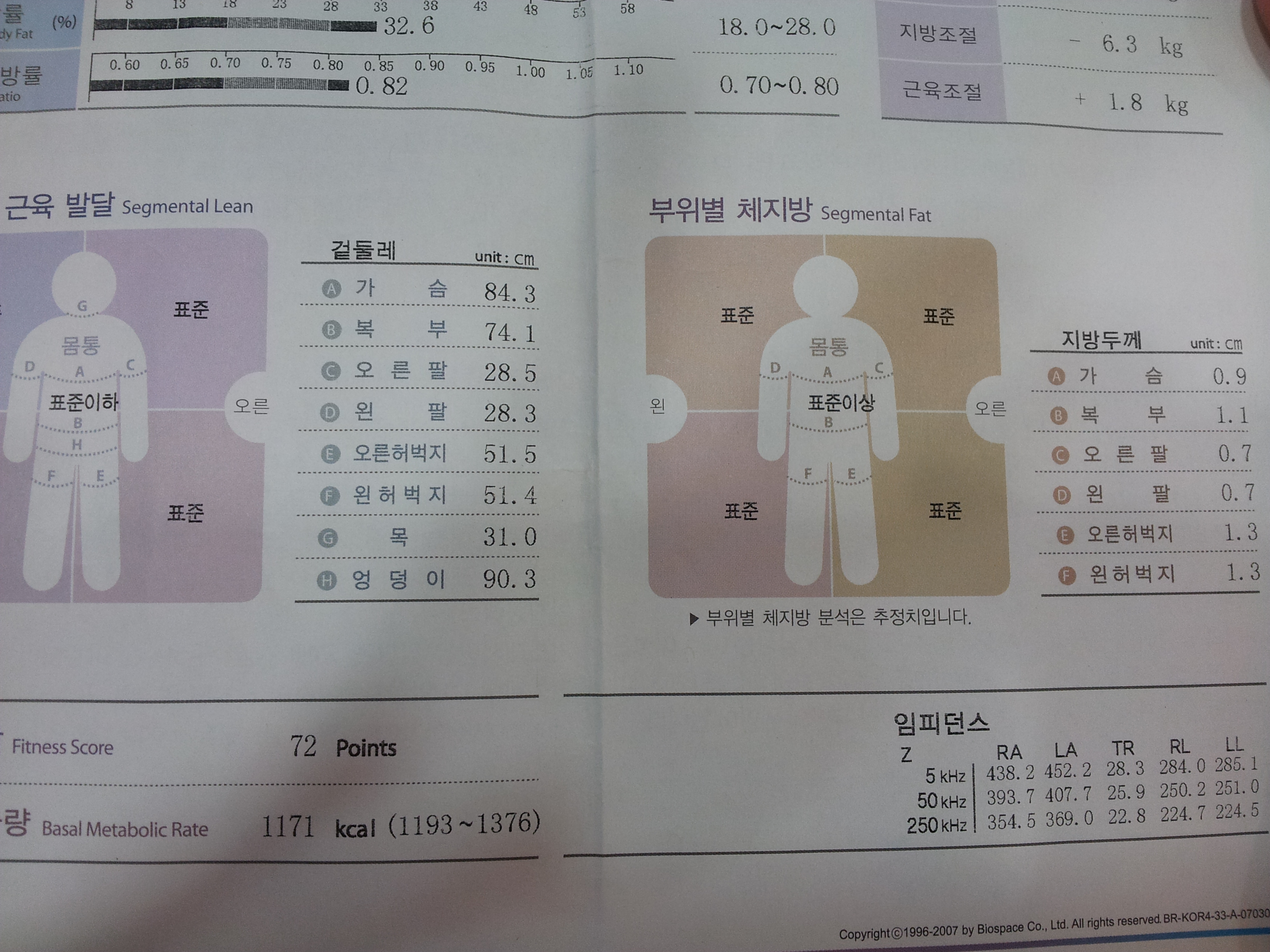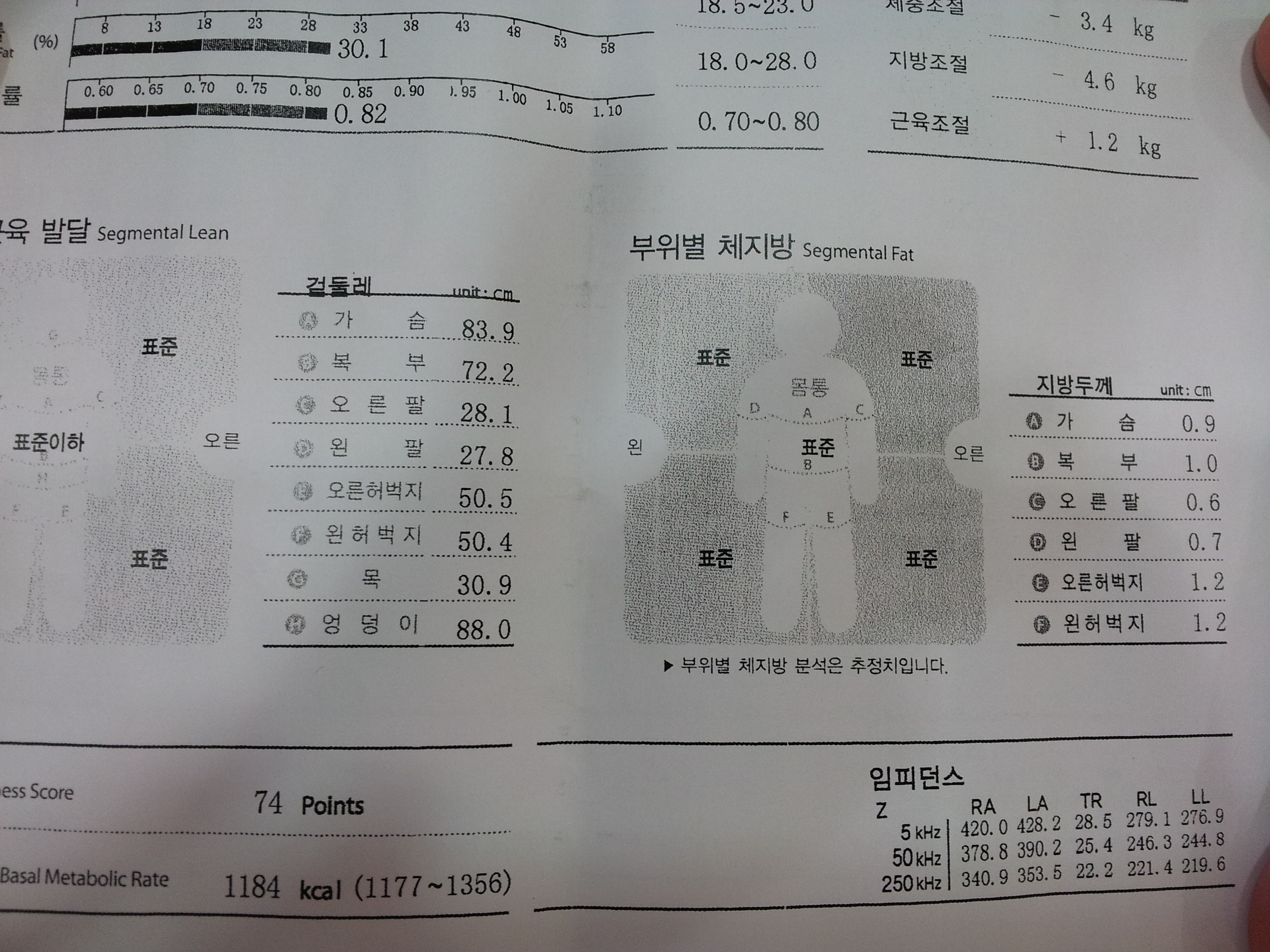처음 재본 인바디체크! 몸무계는 안나와있지만 키155cm 몸무계 58.4kg 입니다