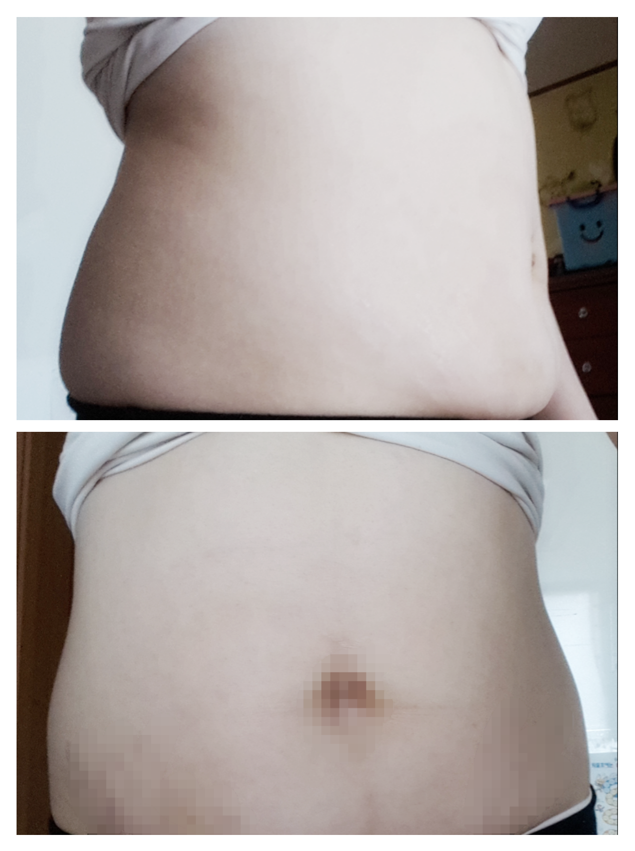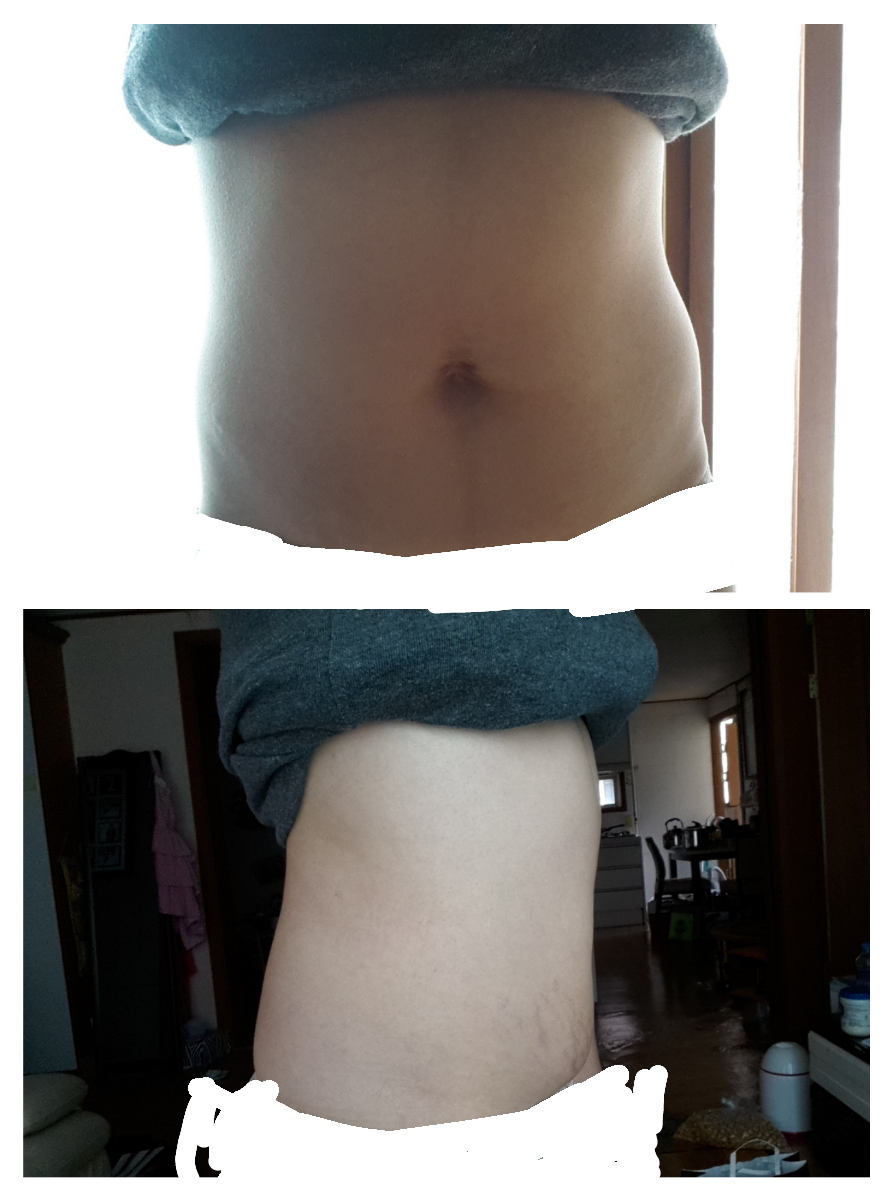 아직 4회만 관리 받은 상태고, 아이 둘을 낳았던 배라서 탄력도 없고 부족하지만..