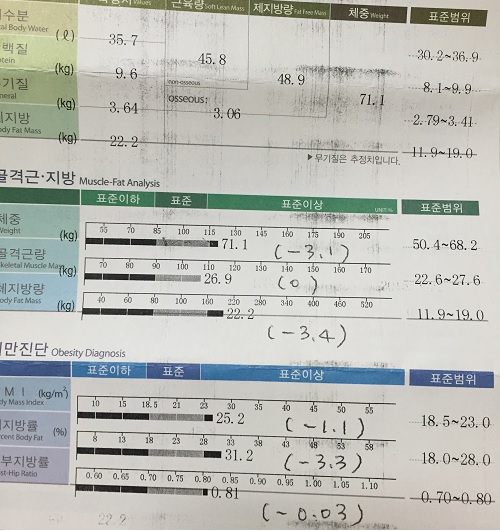 운동은 사실 꾸준히 하진 못했고 주 3회정도 런닝머신 했어요 무엇보다 근력운동을 꾸준히 하지 못했음에도 체지방만 빠지고 근손실 없어서 그게 제일 만족스러워요 그리구 운동,식이만으로 다이어트 하는건 좀 지쳤다고 해야하나?