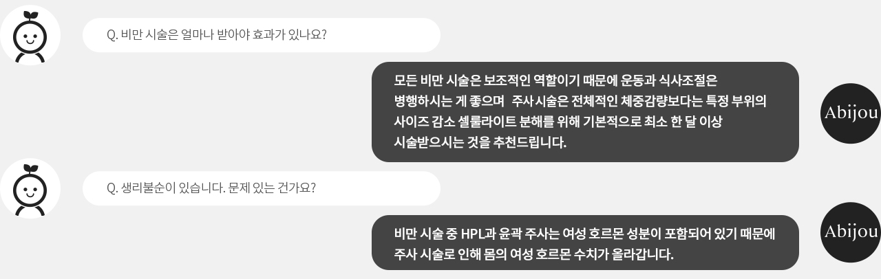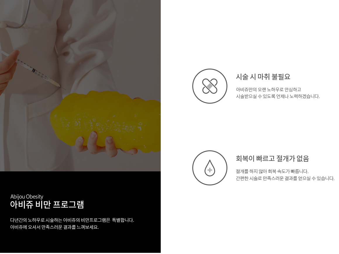 아비쥬의 모든 비만 시술은 수술이 아니기 때문에 칼을 사용하지 않아 부담 없이 시술받으실 수 있습니다.