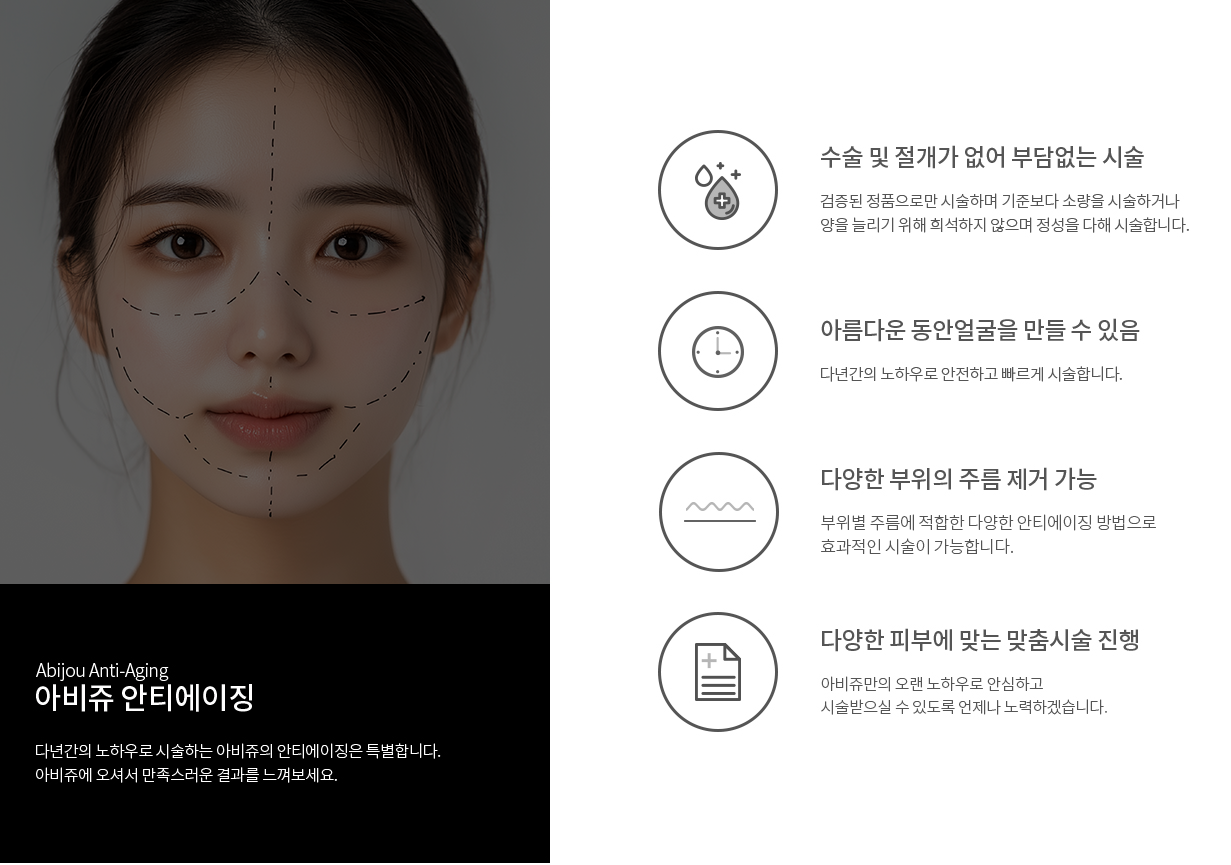 아비쥬 안티에이징은 주름, 처진 피부 등을 절개를 하는 것이 아닌 다양한 방법